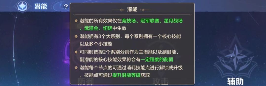 潜能系统目前出来三大系别:攻击、防御、辅助。
