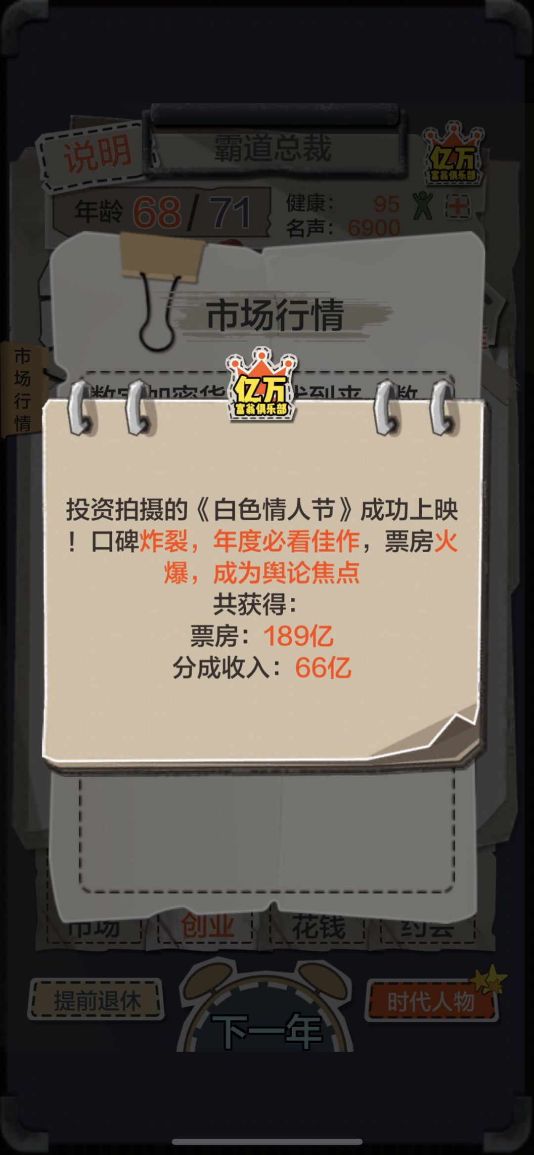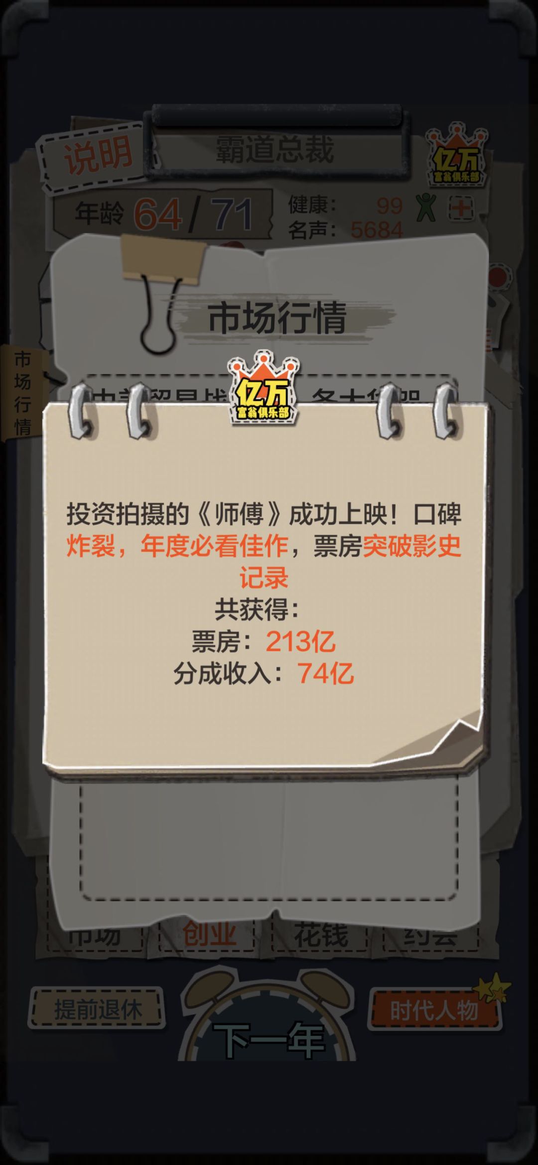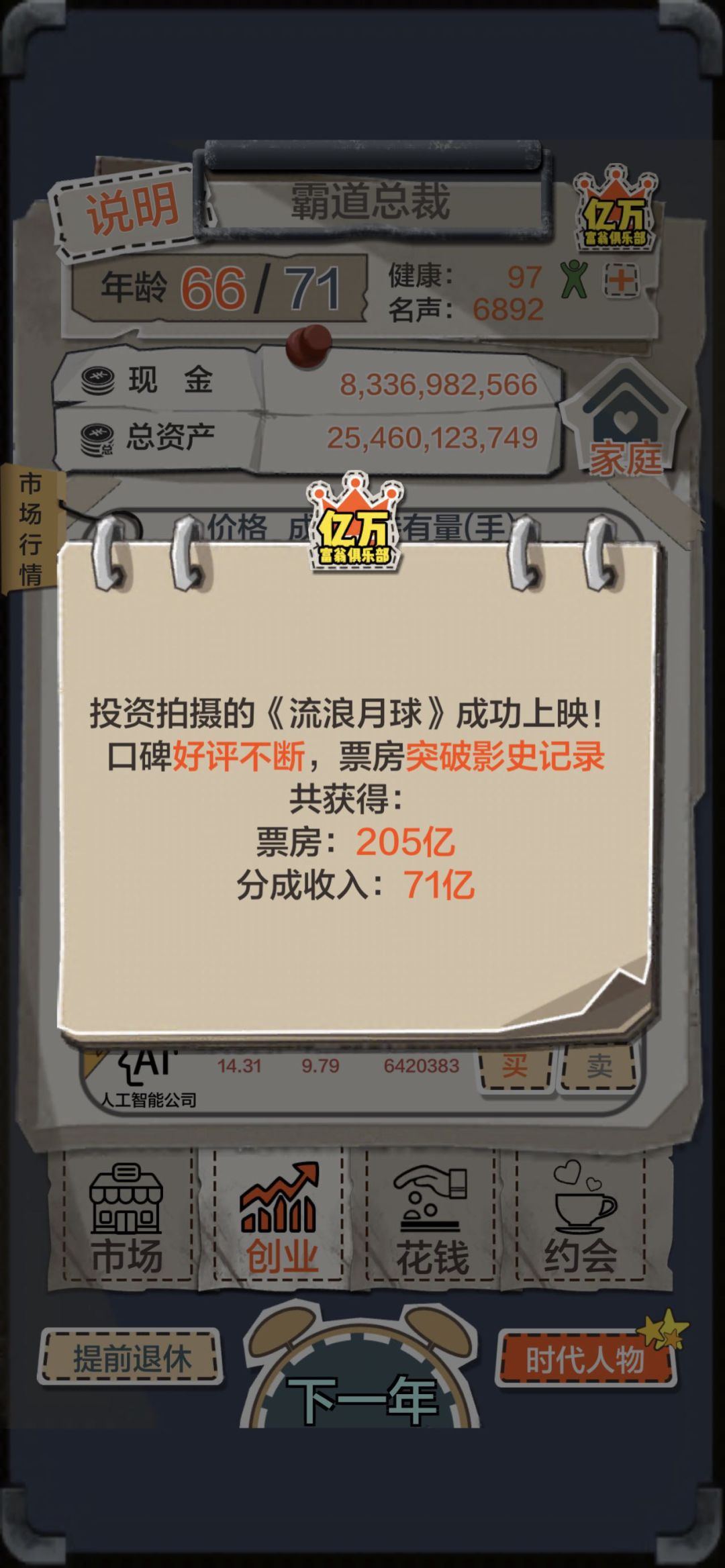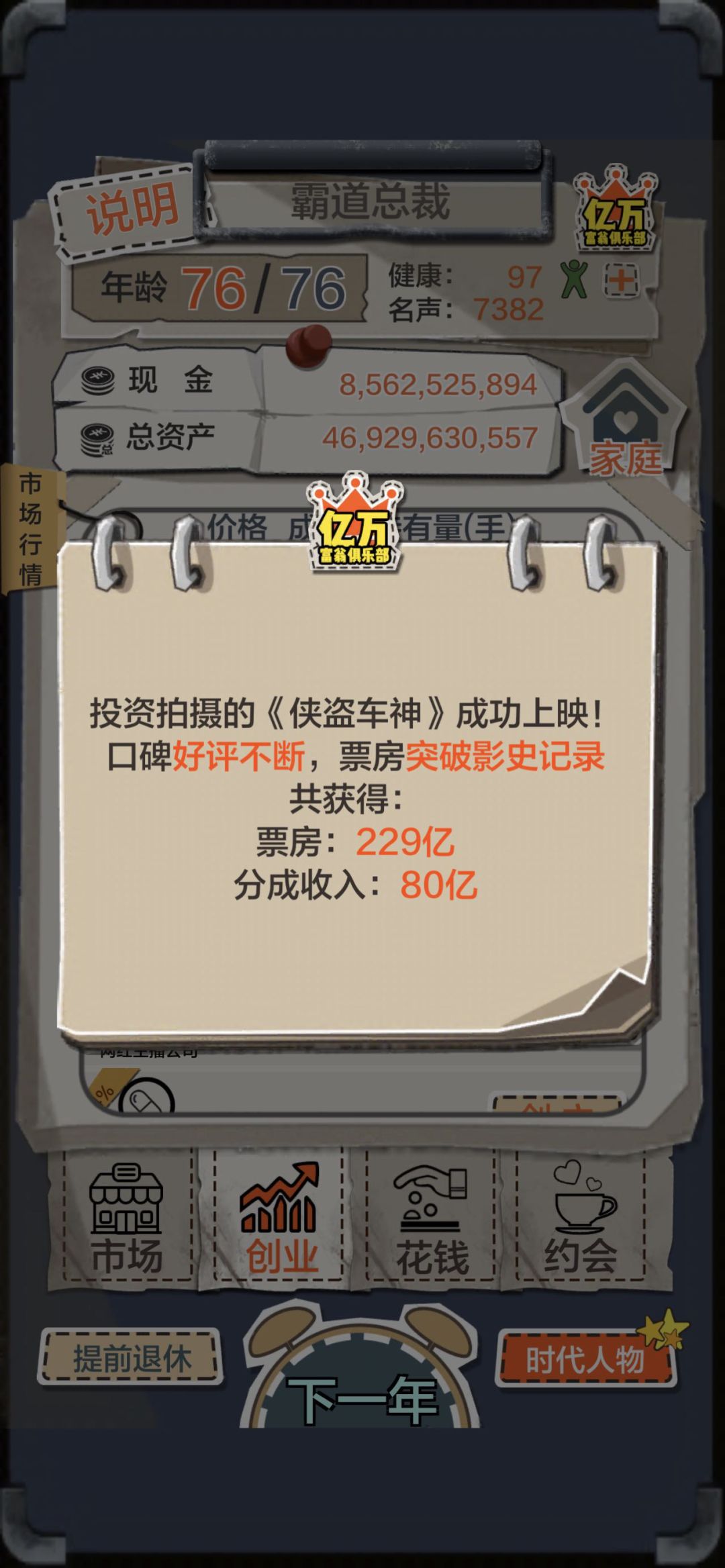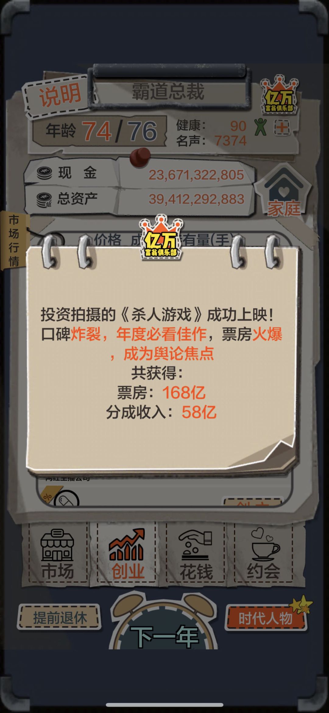 4.拿下第一桶金12亿,以至于我可以直接开始训练球队,打造一支完美球队,蝉联冠军,再以50亿卖出,循环训练所有球队至完美并拿下所有联赛冠军,挖封所有煤矿,至62回合,资产已过百亿,与三线偶像结婚,开始拍电影,所有电影导演与演员均为橙色,该局拍摄了《师傅》9.2评分票房213亿,以及《流浪月球》、《白色情人节》、《怪物史塔克》、《交火规则》、《杀人游戏》、《侠盗车神》7部电影。