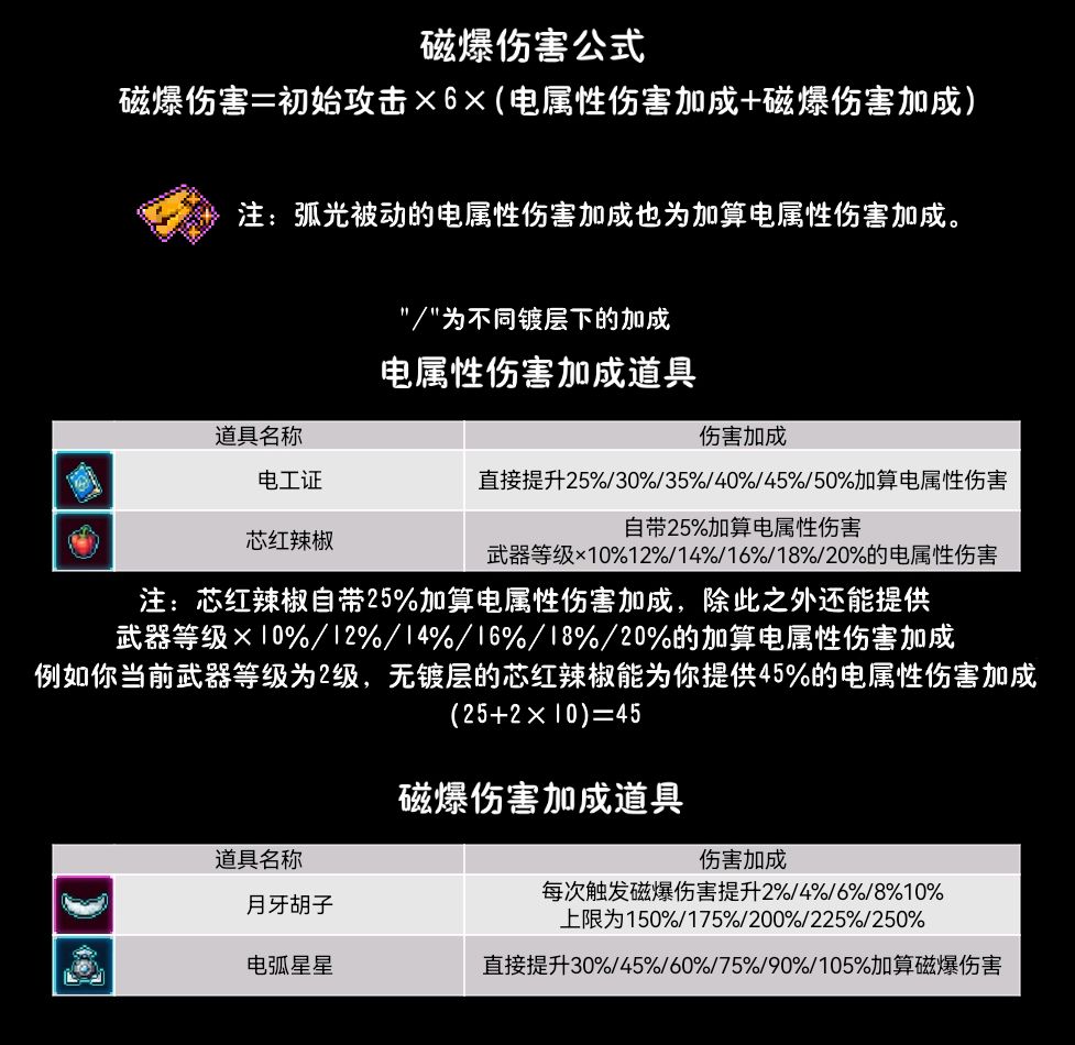 可以看到磁爆的伤害计算自带一个6的倍率,除此之外就只有一个乘区,而电属性的伤害加成与磁爆的伤害加成也是互为加算的关系,因此磁爆的伤害在前期因为有个6的倍率会相对可观,但后期上限较为局限