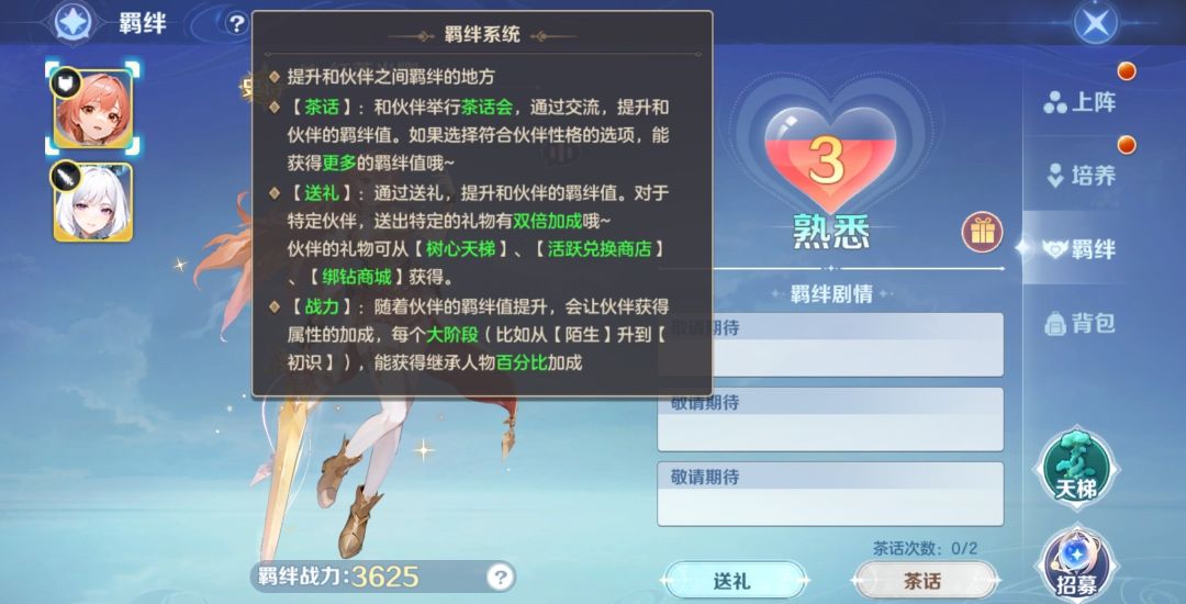 【茶话】:通过与伙伴进行交流,获得羁绊值提升。每天可进行2次,选择与伙伴性格相符的选项将获得70羁绊。(不符的只有50羁绊)
