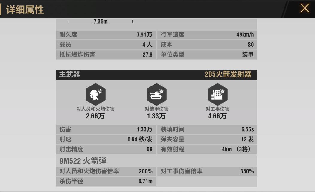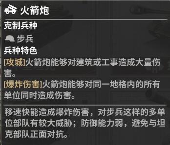 火箭炮有一个特有的射速属性,这个是火箭炮进行一次攻击的时间,数值越低,一轮攻击中每次攻击的频率就越高,并且对工事与对人员都有伤害倍率的加成,导致一次性就能对步兵单位造成毁灭性的输出