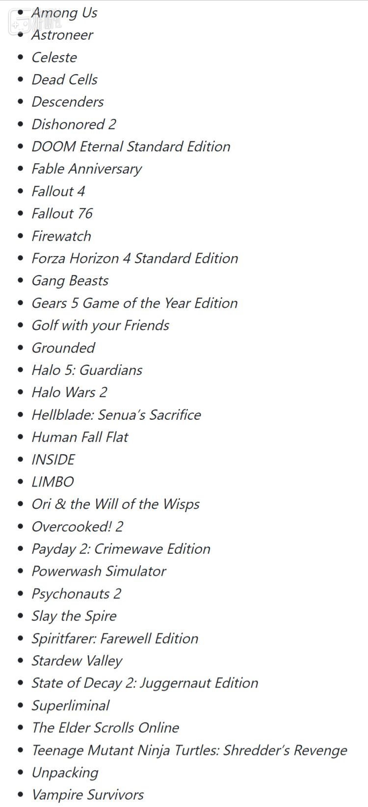 4.Xbox Game Pass Core(原Xbox Live金会员)畅玩游戏名单公开,共36款,包括《死亡细胞》《杀戮尖塔》《人类一败涂地》《吸血鬼幸存者》《DOOM Eternal》《光环5:守护者》等。