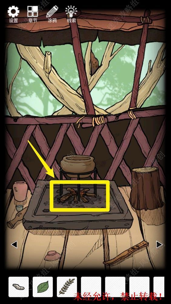 103.将【钻火棒】放在下图所示的木板上,点击按住【钻火棒】后,持续左右划动若干次,直到顺利生火。 103 103.1