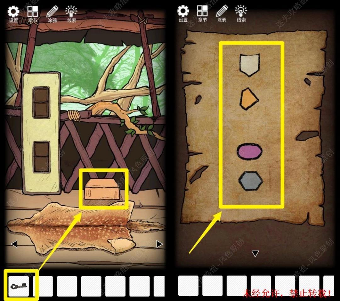123.使用【钥匙】打开图中所示的箱子,点击进入查看图案线索提示。图2所示即是对应的图形顺序。 123 123.1