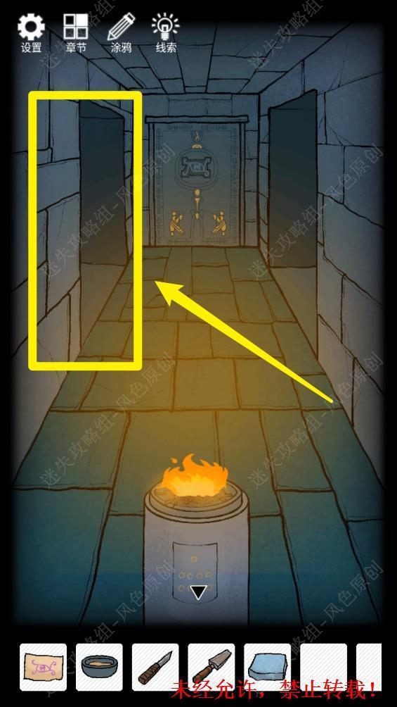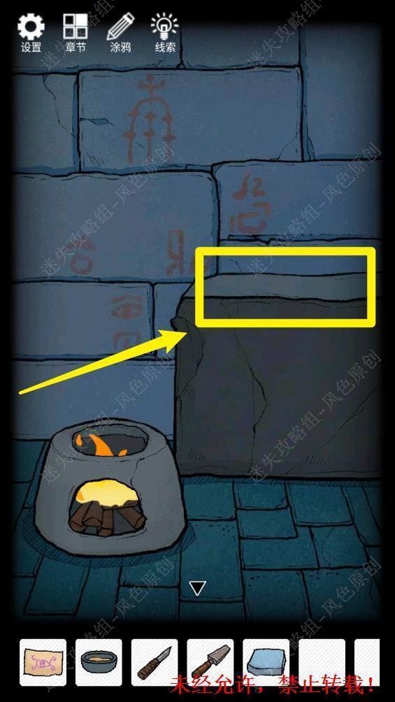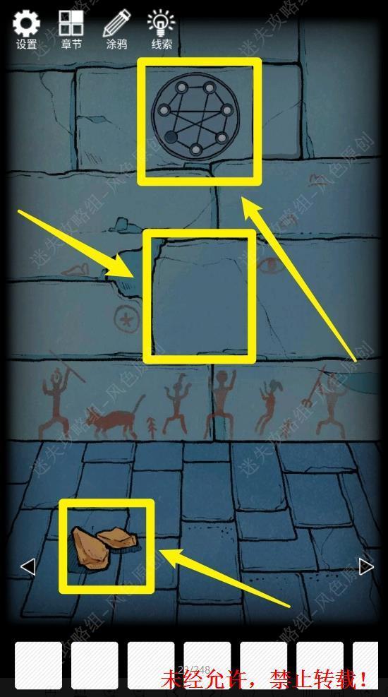 141.切换场景,点击获取地上的【打火石】,触碰上方的圆盘参与小游戏,同时中间的墙体,点击数次后,可获取剥落下来的【石板】。 141