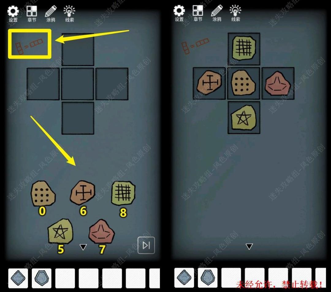 135.点击鹿雕像,参与小游戏,观察左上方的提示,可知需要让横行=竖列。下方的五个图案分别代表不同的数字(图案中的线条数即为其所代表的数字)。将五个图案按照如图所示摆放即可。 135 135.1