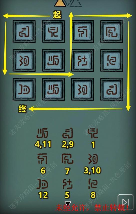 130.来到下图场景,点击老鹰雕像参与小游戏。如图2所示,假设从入口开始沿路线行进,标号1的位置显然处于我们视角的右方,标号2的位置则处于视角的左方,所以先点击下方的右按钮,再点击左按钮,即可将1号和2号位置点亮。根据此思路,按照“右左右左左右右右左右左左”的顺序点击下方的两个按钮即可完成小游戏。 130 130.1