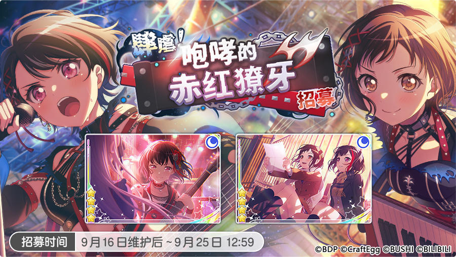 9月16日维护后,游戏内将开启「刻入天穹傲岸的烈光」任务演出活动和「肆虐!咆哮的赤红獠牙招募」,并追加原创歌曲《IGNITE GLOW》!此外,游戏内将在维护后追加由MyGO!!!!!演唱的歌曲《迷路日々》及该曲MV♪欢迎大家登录游戏查看~