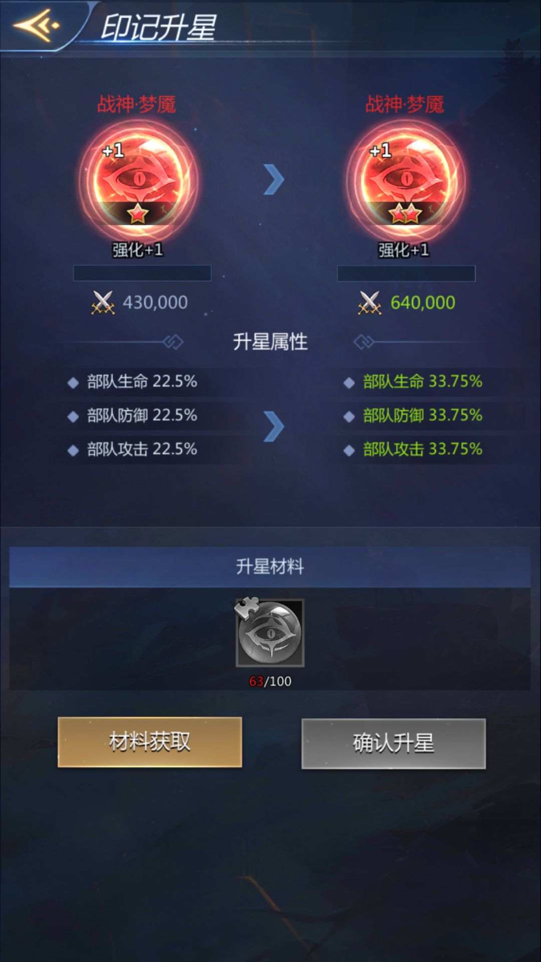 入口:印记 或 印记仓库界面,点击要升星的印记,点击界面的“升星”