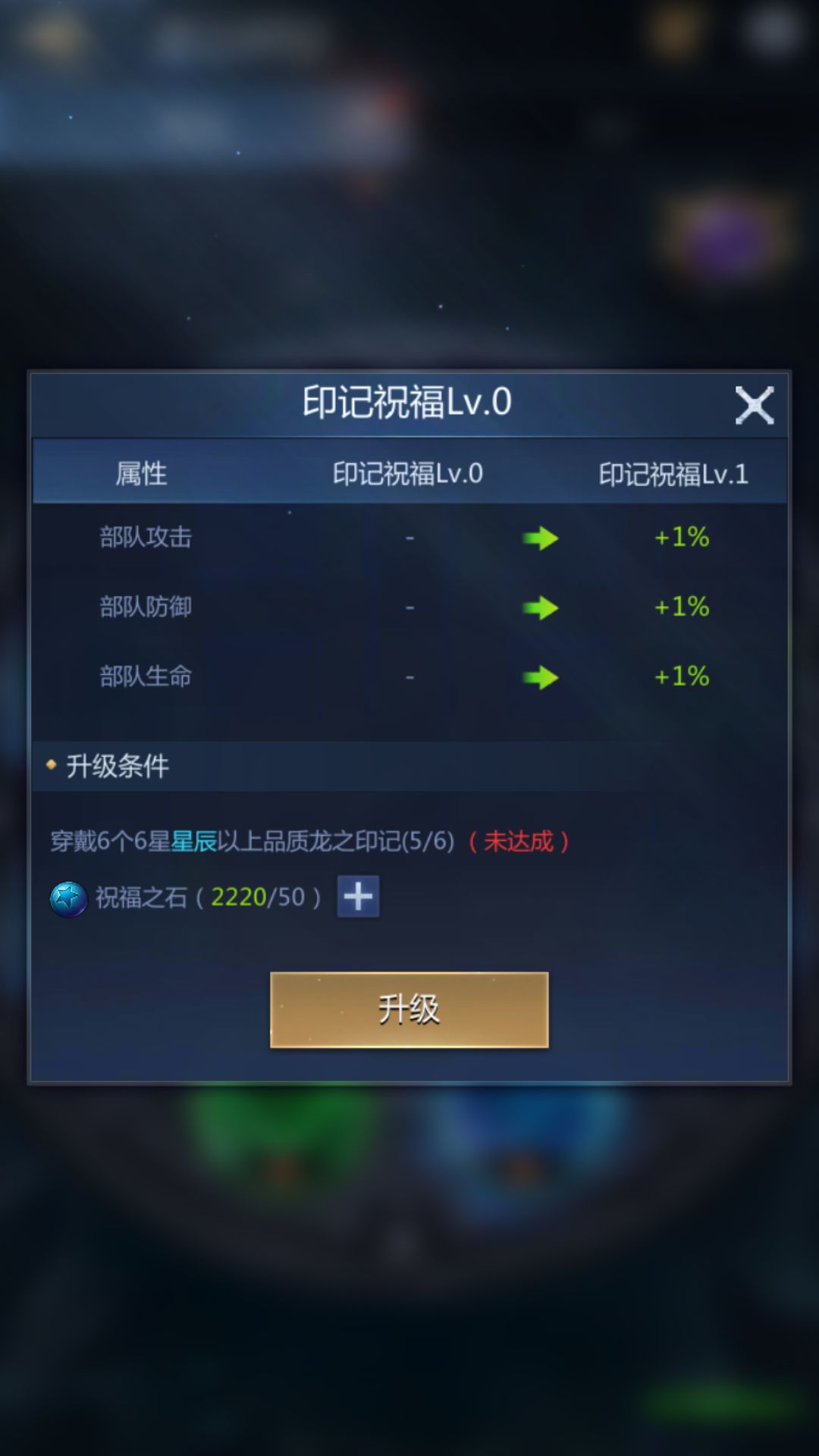 达成界面要求的升级条件,使用祝福之石升级印记祝福,并获得相应属性