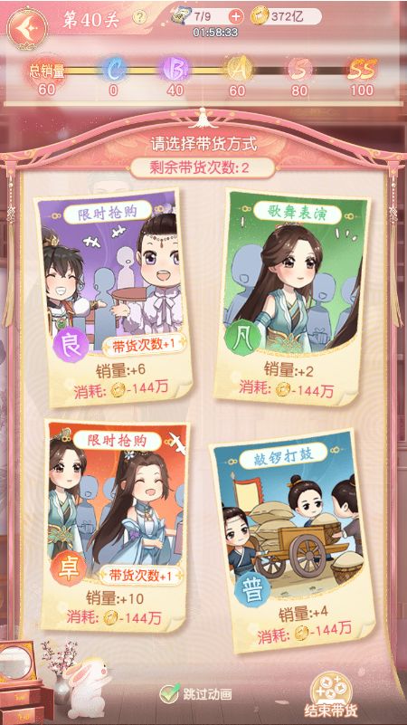 带货过程中,掌柜需要选择带货方式,每次带货有一定的带货次数,带货方式选择中有时会出现次数+1的选项,掌柜点击此方式可额外在此次带货中获得一次带货次数,带货方式有不同品质,品质越高的方式获得的销量越高,带货时需要消耗铜钱。