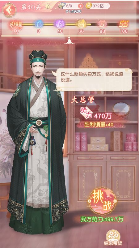 带货次数用完时,可挑战大主顾,挑战成功将会获得大量销量,提升评分,提醒下掌柜,评分需达到ss评分才可快速带货,进行扫荡。