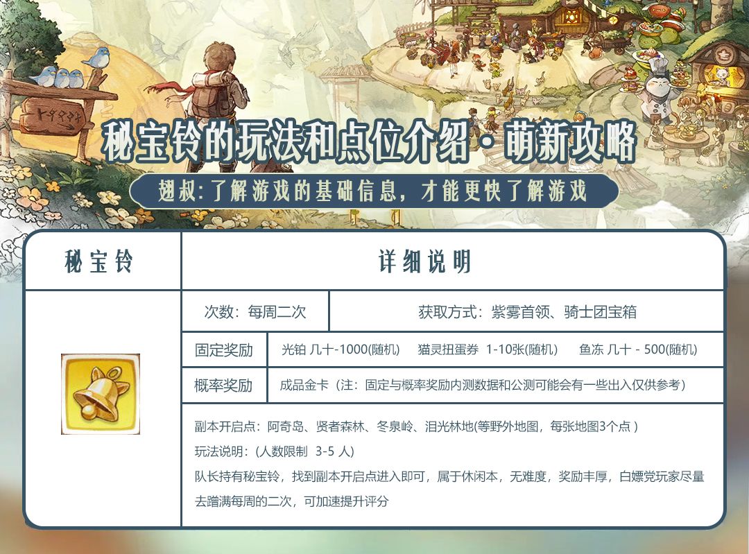 哈喽 小伙伴们好呀, 今天翅叔又出现了,今天给小伙伴们更新一下秘宝铃的玩法和出现的地点介绍