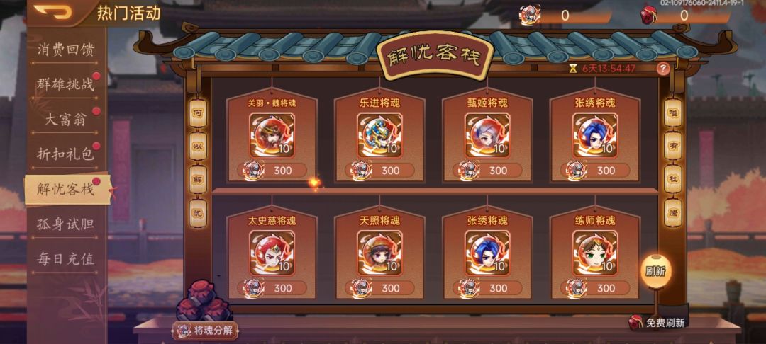 活动内容:活动期间,可通过【武将之魂】兑换将魂,可通过【解忧酒】刷新客栈的将魂,每天有一次免费刷新次数