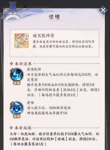 虎噬乾坤(可以发动3次):根据双方损失气血比例触发提升吸血率和穿防效果,同时挂给自己挂上3回合抵御buff(持续2回合)