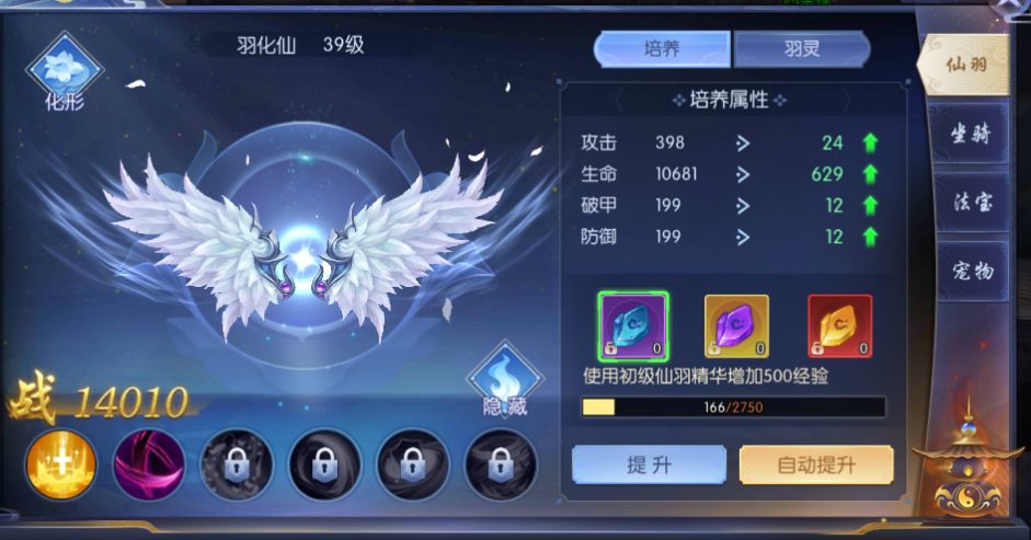 在【仙羽】界面我们能看到组成仙羽的几个部分,分别是【培养】、【羽灵】、【化形】