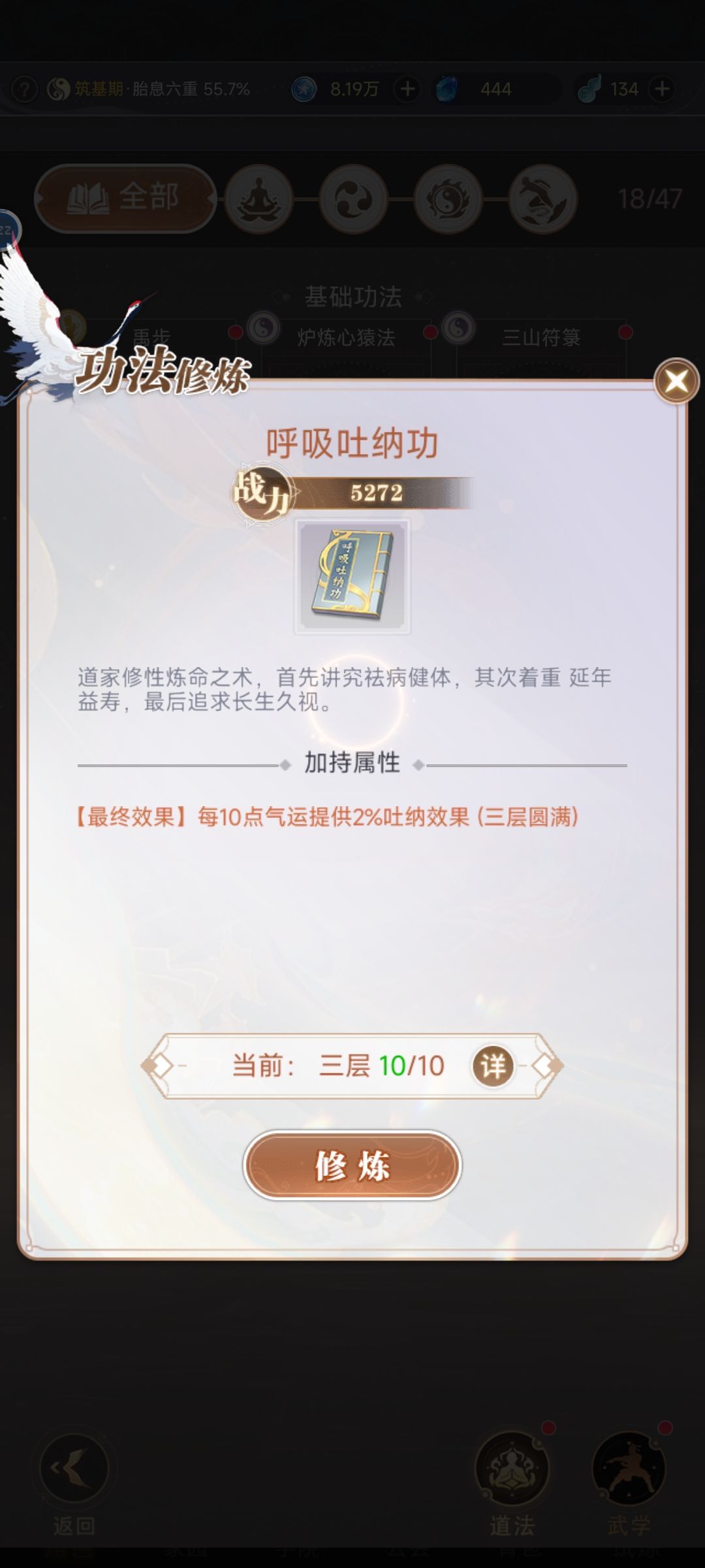 主线任务:吐纳功圆满(吐纳可以等这个拉满了在吐纳)
