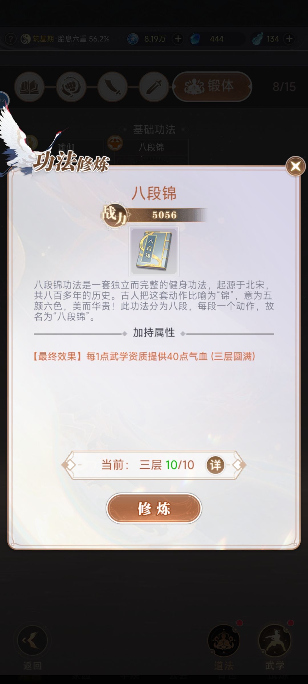 还有一个功法就是这个八段锦 1点武学资质加40气血 武学资质很重要关系到后面的其他功法 有门槛的 这个八段锦刚好匹配 100点武学资质就是四千血量