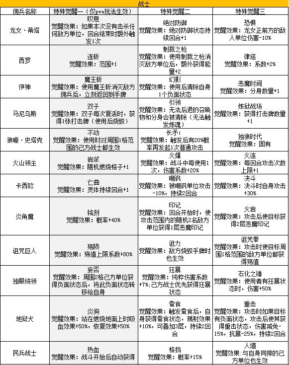 注意:下方佣兵第一个特殊觉醒只在pve内容中生效