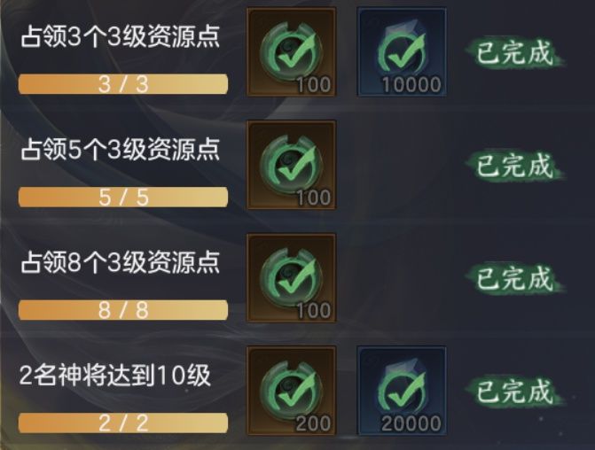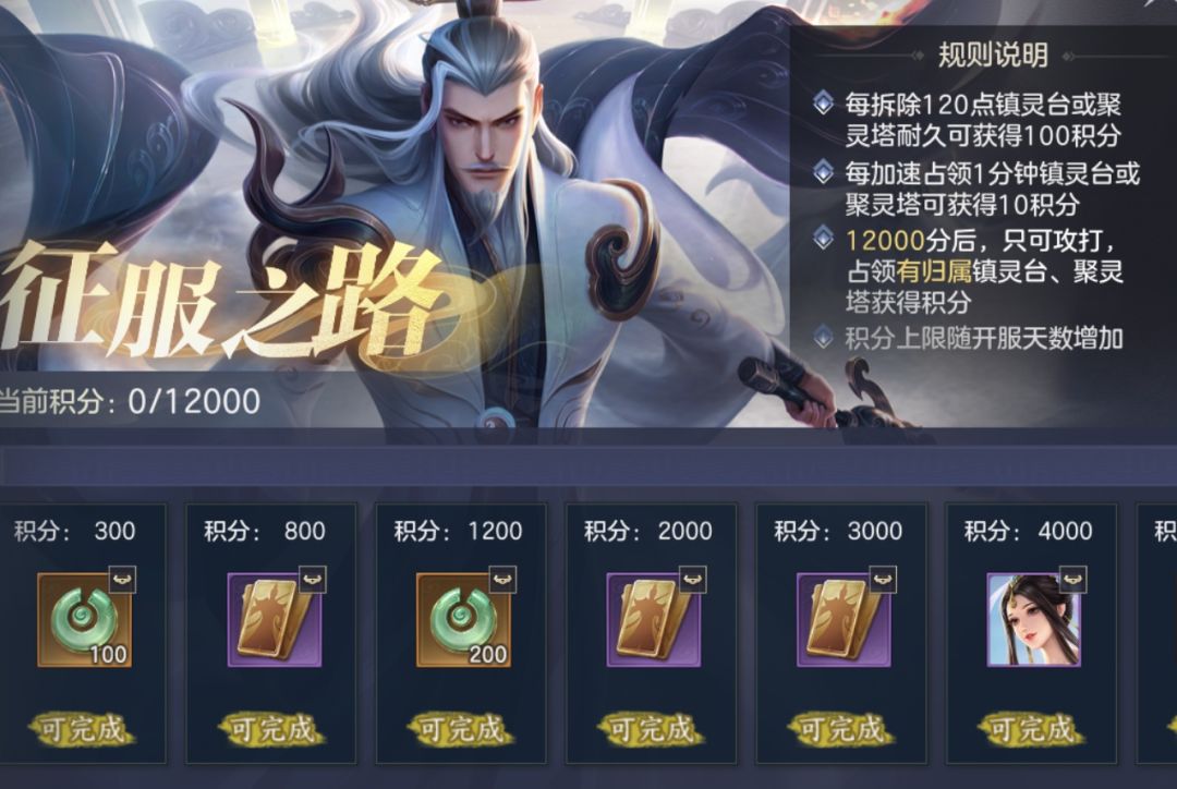 第一天能拿的玉不止上面那些,继续推任务和打地,多余的队伍位置把不用的三四星将放上去,给一点点兵,然后放出去占聚灵塔和镇灵台,能加征服之路的积分,积分高了也有玉和神将领。