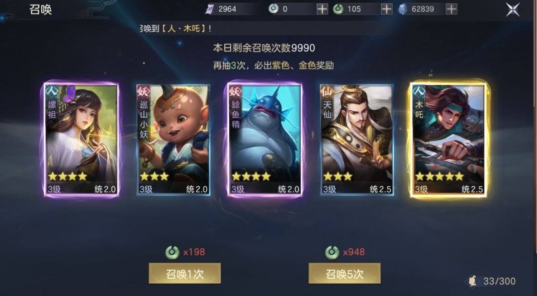 打完9块3级地后,第四章任务+地仙任务+仙路之始能给800玉,玉攒到1350,直接开抽!先来个半价,然后五连。不过不要期望太高,这里第一次五连基本出不了五星(至少我几个号没出过),老老实实等12抽的保底吧。