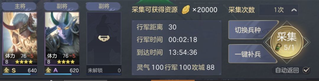 第二次五连:前面剩的300多玉别手痒单抽了,0氪就得精打细算。完成第五章任务,玉攒到503。4本点出先锋台-天,放一个2.5统四星将到一队,等级可以和系统给的10级杂兵交换一下拉到10级,方便直接出征打4级地。建筑继续按照任务指引升级。