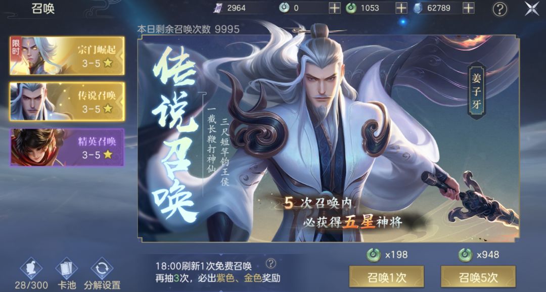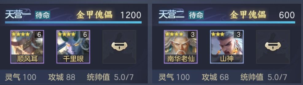 唤神符可以抽3-5星池子,开局第一次五连基本都能有个四星,抽到的南华,等左慈有了作第二队。