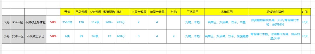 第一张图是目前大小号的基础养成对比,做了个EXCEL,一目了然