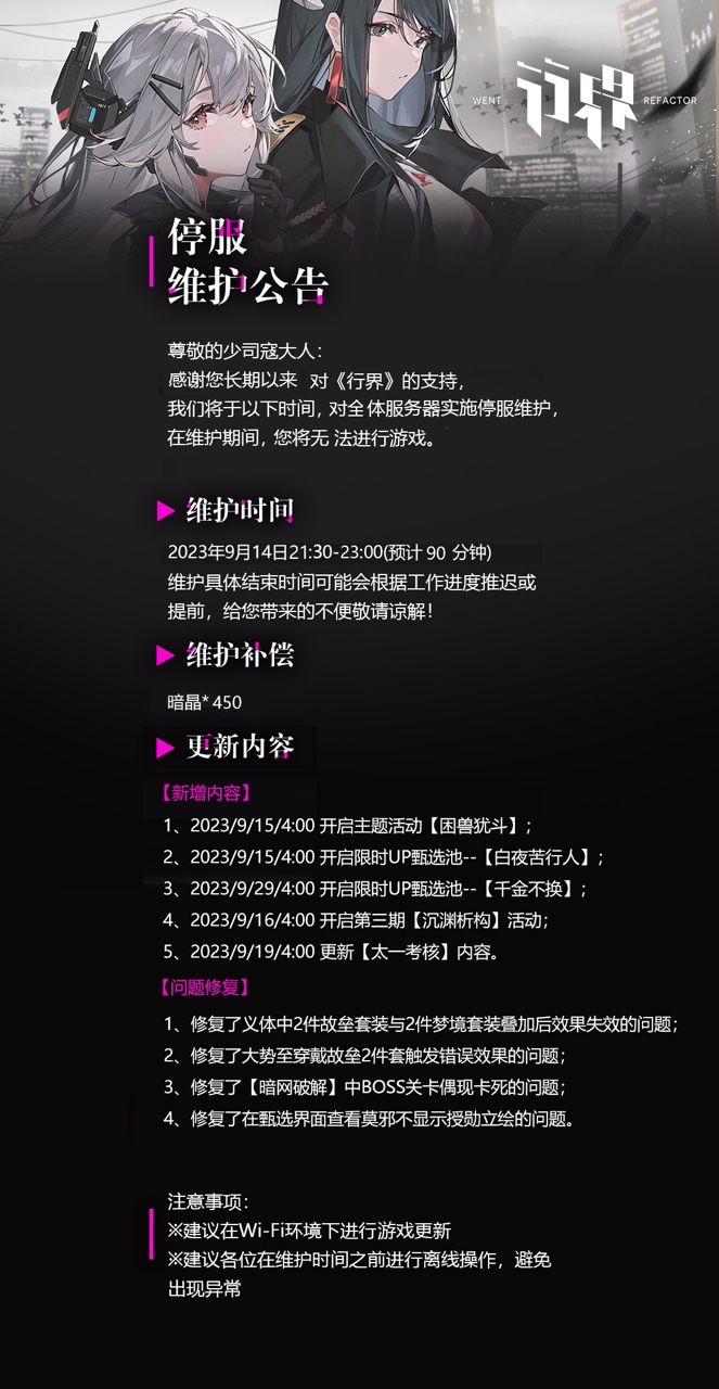 感谢您对《行界》的支持,我们将于以下时间,对全体服务器实施停服维护,在维护期间,您将无法进行游戏。