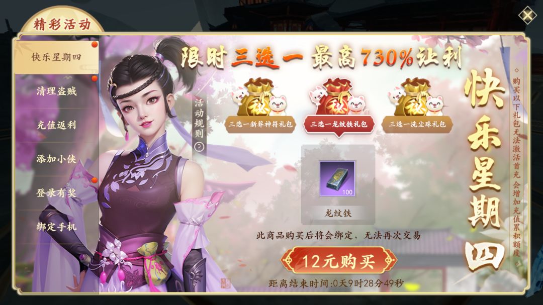 今天的快乐星期四和往常有所不一样,有些少侠希望快乐的方式不只是一种,于是这次我们上架了三个礼包,少侠可根据需求任选其一!除了新莽神符礼包,还有龙纹铁和洗尘珠礼包等待大家选择。