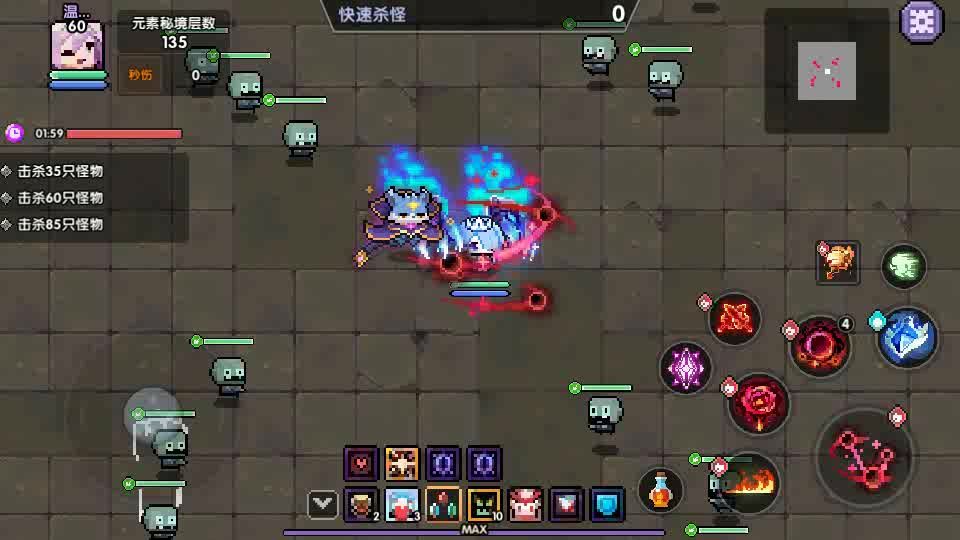 通关思路主要是,人与怪群尽量排在一条线上,让普攻与紫技能尽量能打到更多的怪,还有注意别被小僵尸攻击到,否则变僵尸之后无法使用技能,少很多输出