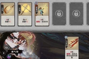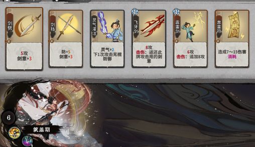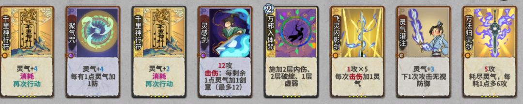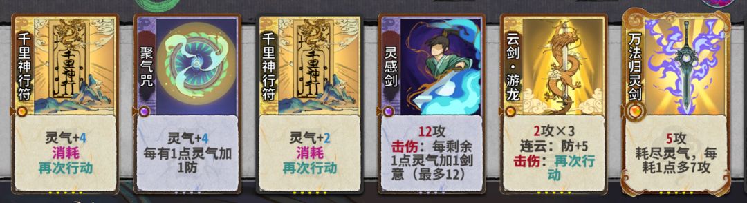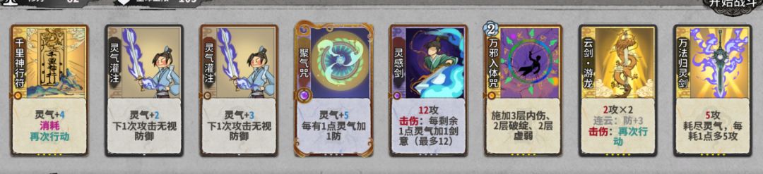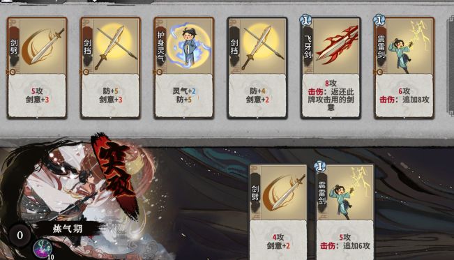 第一种就是原始的剑意套,这是适合新手的打法,剑意套的排序是剑劈剑档,灵气灌注,飞牙剑,震雷剑,我们后期需要的核心牌就是灵气灌注,所以尽量保持你在前期尽可能的d到一张及以上的灵气灌注.