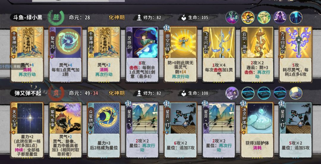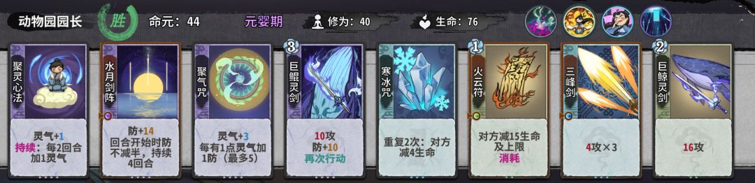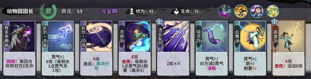 8.接下来我将会讲第二套,这一套并不适合新手过度,前期不d或者少d,靠白嫖活到第8轮是元婴d,巨坤,鹏,白鹭,灵感剑这些牌来渡过,我们在元婴可以d10次左右,在化神的时候在20d以上就行。