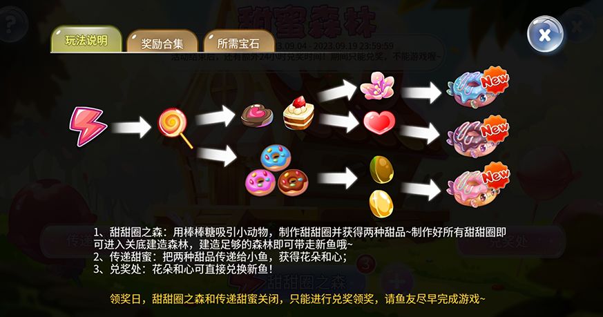 完成任务走到终点,将甜蜜带给小鱼,获得它们答谢的礼物。收集花朵和心心,就可以到兑奖处中领取鱼儿奖励辣~