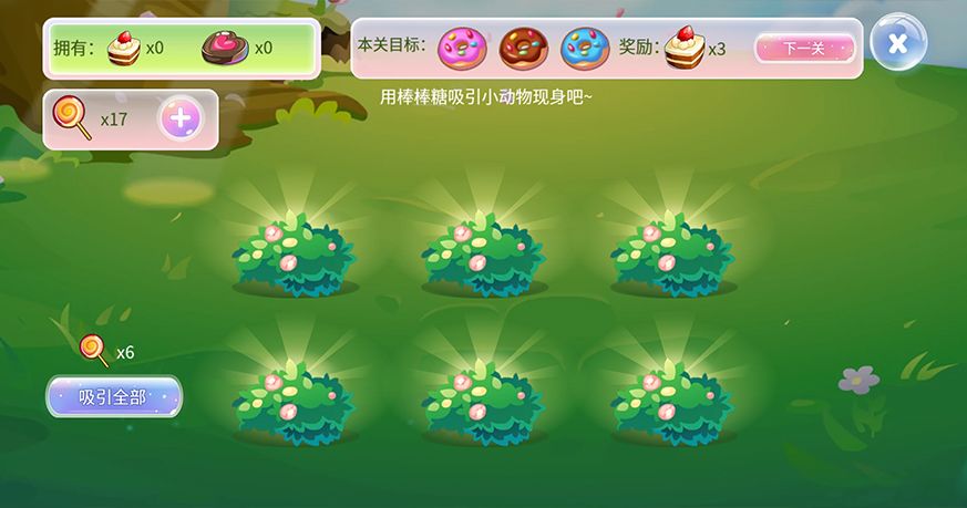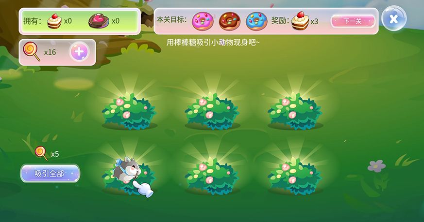 开局我们会携带一定数量的棒棒糖,点击草丛,使用棒棒糖吸引草丛中的小动物来获取巧克力、蛋糕以及其他奖励,并收集过关需要的甜甜圈来通往关底。