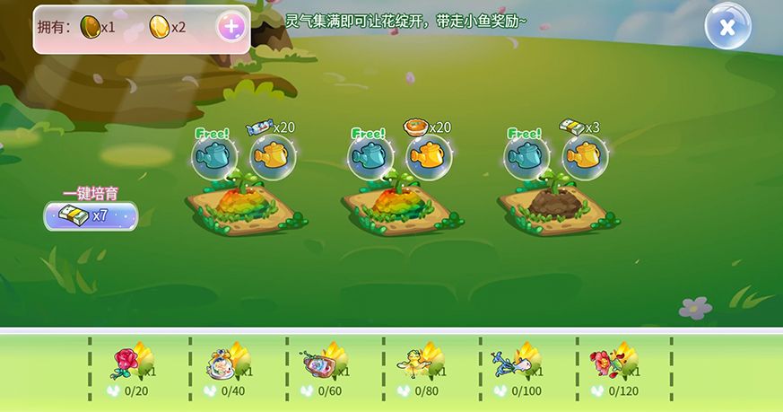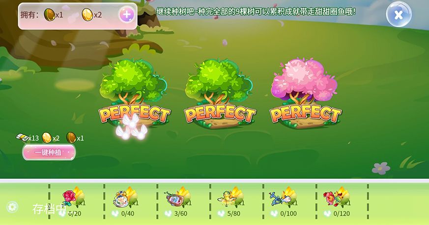种出大树后还有机会获取小精灵,下方鱼儿对应的小精灵集满即可带走鱼儿奖励~每关种出全部大树还可累积成就获取甜甜圈鱼哦~