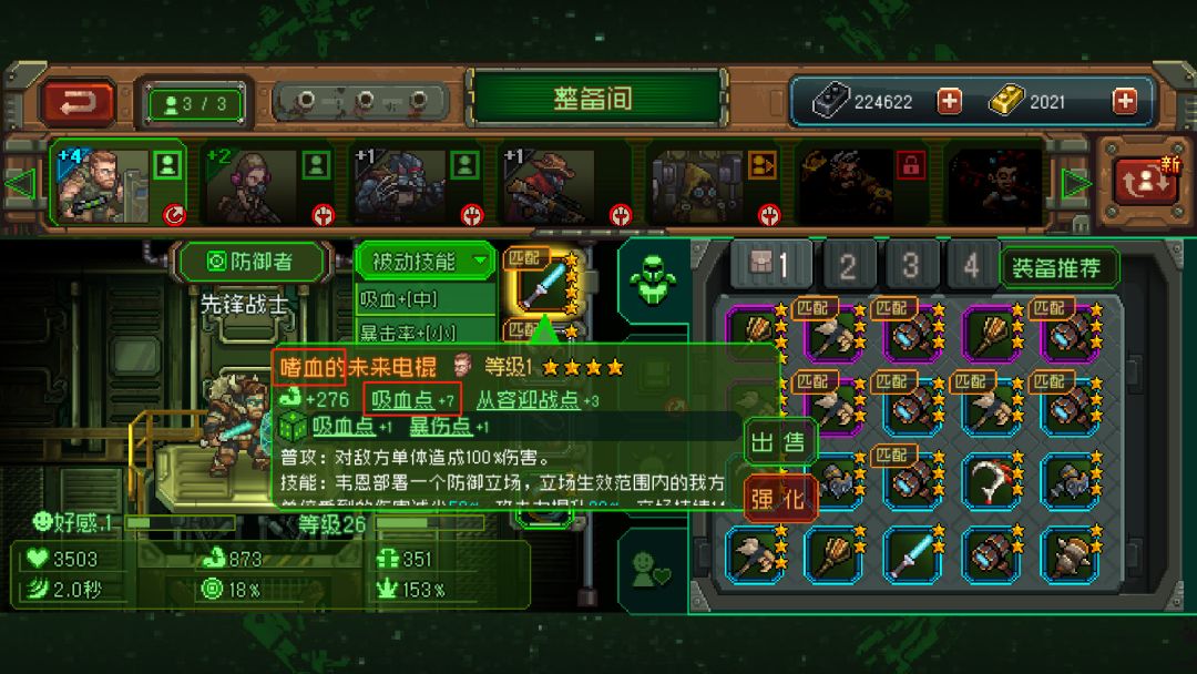 其次就是选择武器,目前拥有嗜血前缀的武器一共有三个,分别是【嗜血的未来电棍】、【嗜血的英灵之怒】、【嗜血的风暴战锤】。首推的是【嗜血的未来电棍】,它可以部署一个防御立场,该立场范围内的我方单位受到的伤害都会降低。不论是保护我方后排,还是给韦恩(毕竟不是纯肉盾,防御能力需要提升)所在的位置扔一个,都是不错的选择。