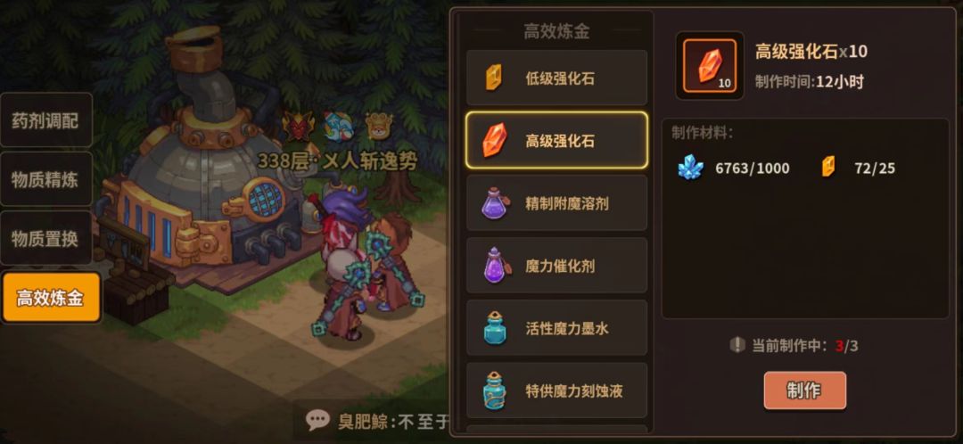 - 如果佛系游玩,较少下本刷金,可以配比时间和资源,制作高级强化石,进行装备强化。