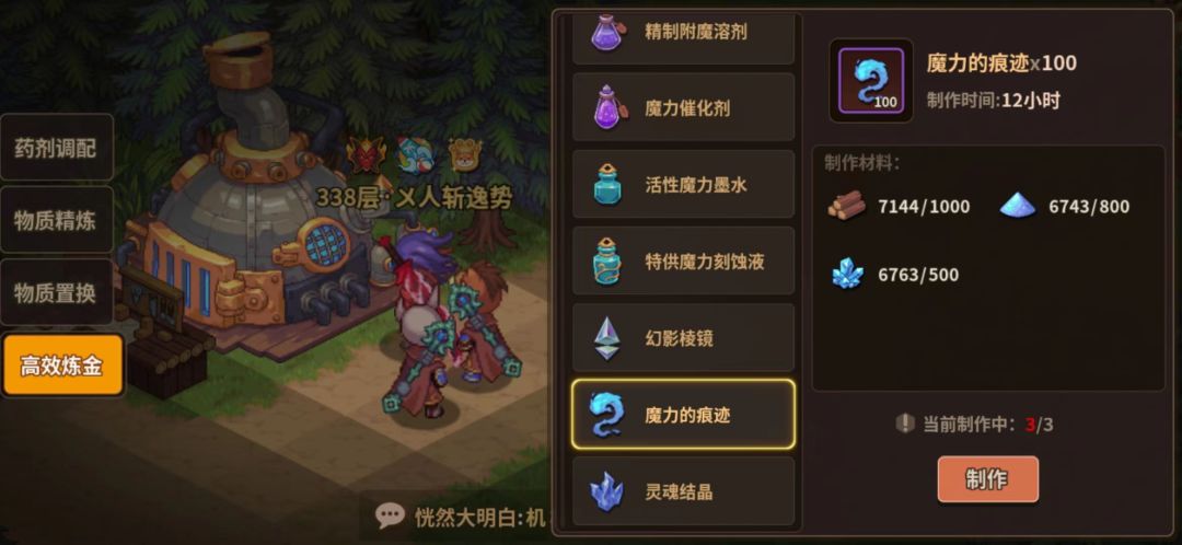 - ①制作:高效炼金<魔力的痕迹*100>,消耗<粉尘800,木材1000,魔晶500>,每日*2次;