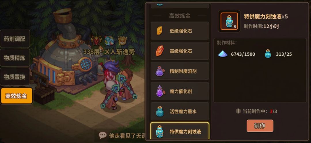- ②进阶:高效炼金<魔力催化剂*1>,消耗<魔晶800,粉尘800,木材800,精制附魔溶液5>,每日*2次。