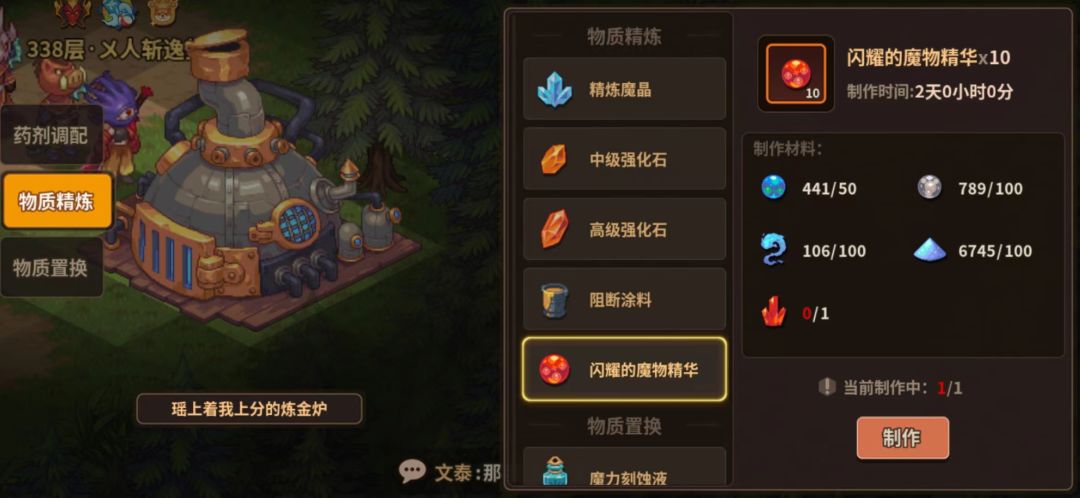 - ①制作:物质精炼<闪耀的魔物精华*10>,消耗<蓝色魔物精华*100,紫色魔物精华*50,魔力的痕迹*100,粉尘100,火元素结晶*1>,每日*1日。
