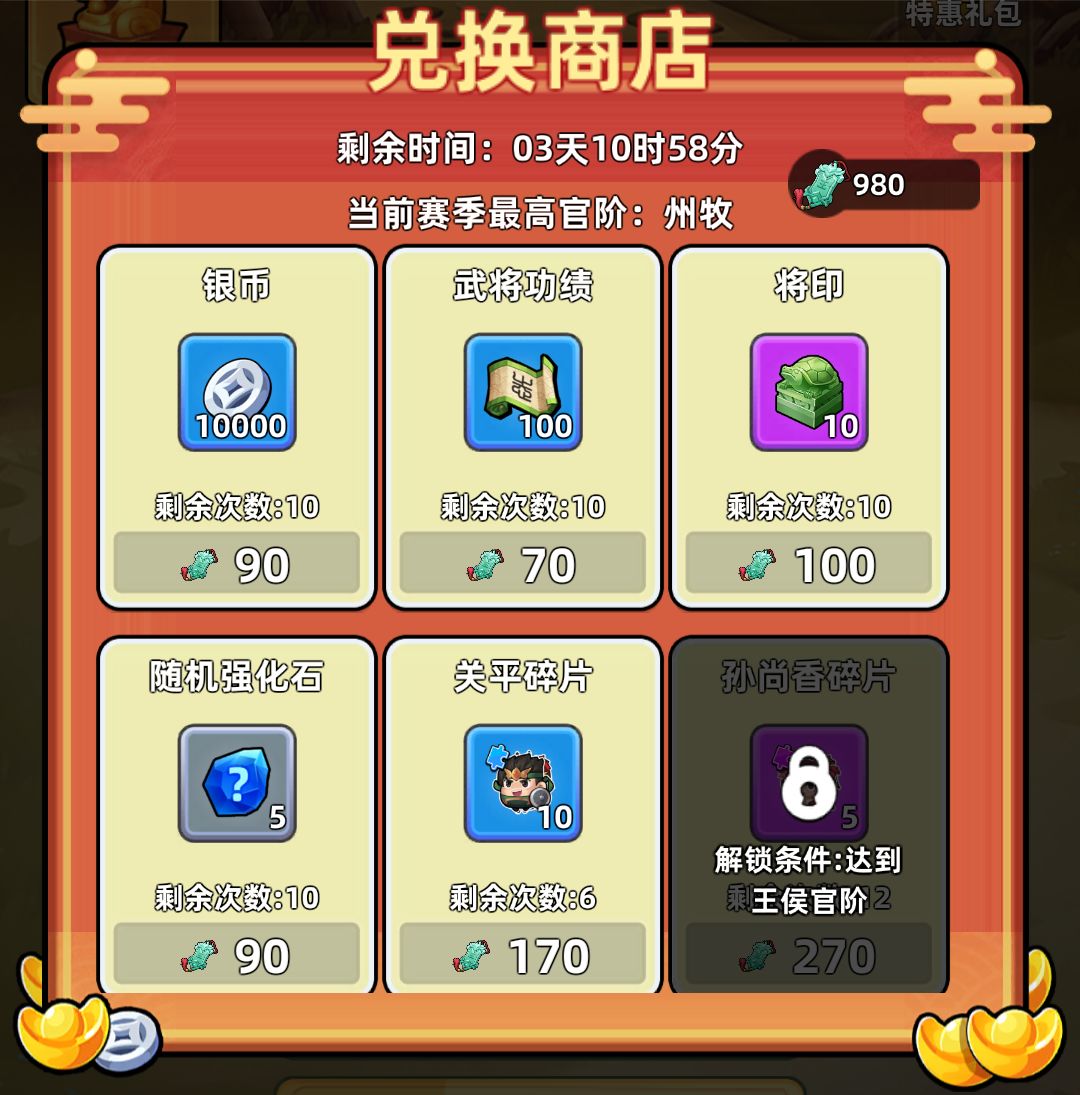 这里面的兑换商店,每期都会不一样,但总的来说推荐角色碎片>将印>随机强化石>武将功绩>银币,关平碎片就不换了,后面溢出很多也没什么用。将印是很重要的,后面武将升级就卡在将印这里。