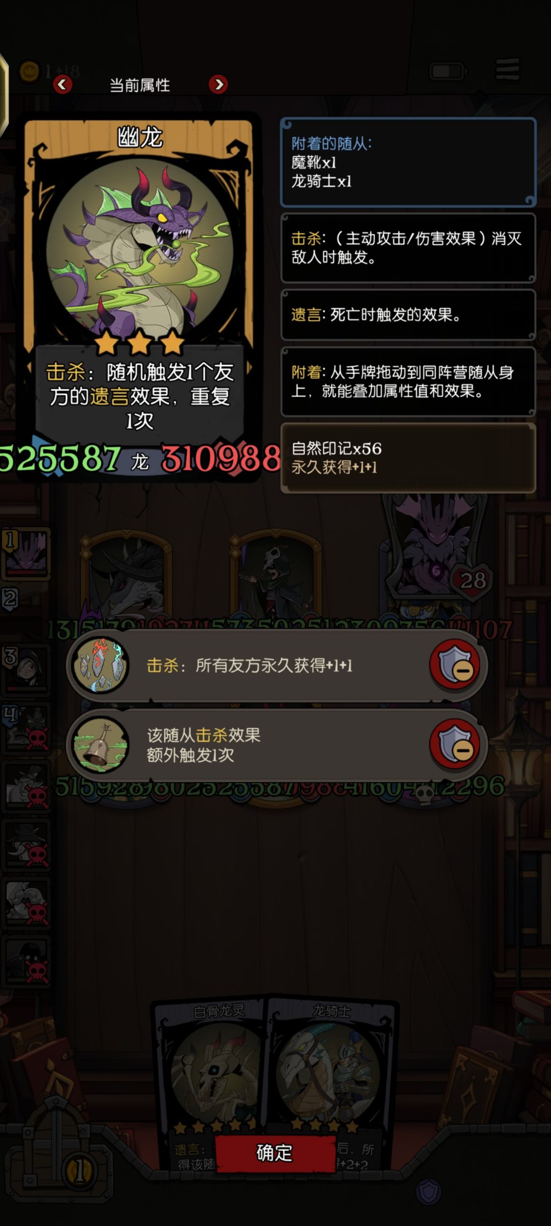 白骨龙灵遗言给队友增加自身属性相同的数值(这个效果是可以加到白骨龙灵自己身上的,然后会根据增加之后的属性再传给其他卡)