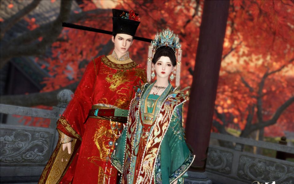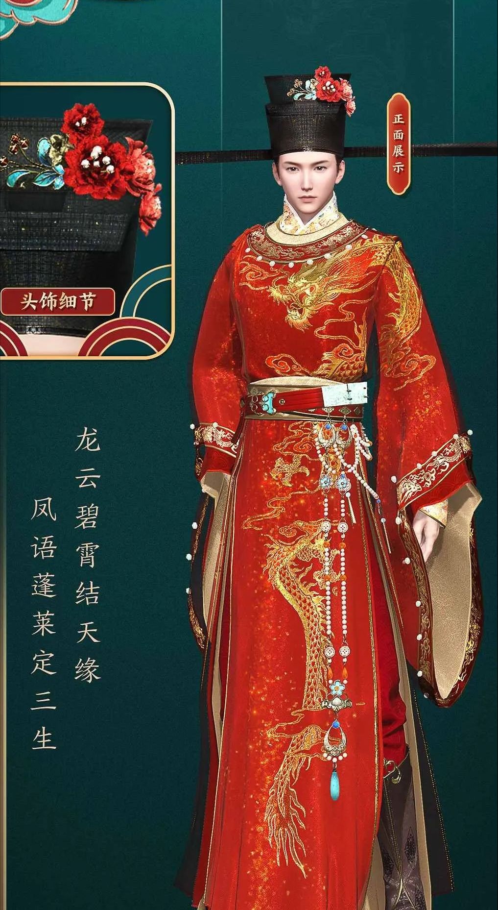 2、【凤语山盟】/【龙云海誓】:这一款是属于宋朝正统婚服,红色代表喜庆,绿色代表神圣。