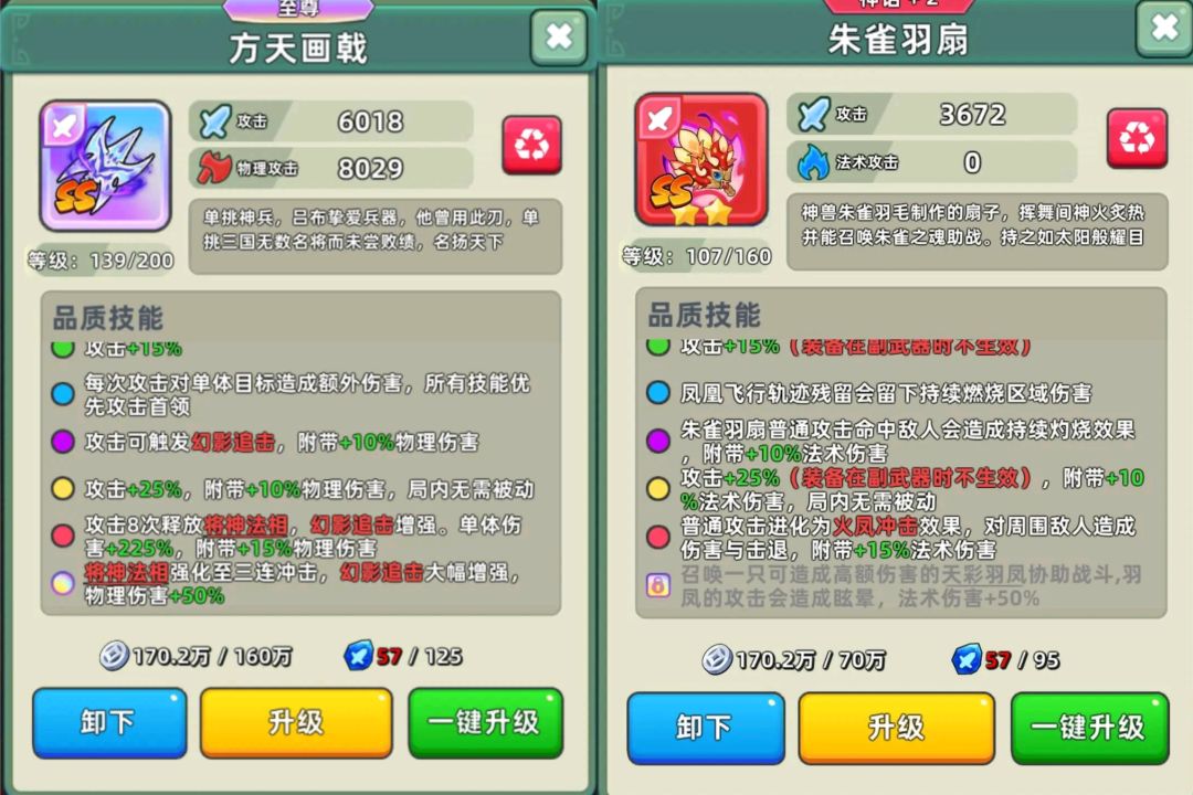 两把武器的强度不用我多说,不过一个打单体,一个打群攻控制,一个物伤,一个法伤。大家可以按自己选择的套装来选择,因为套装的头和鞋红了以后对ss级武器有伤害加成。个人更推荐朱雀羽扇。