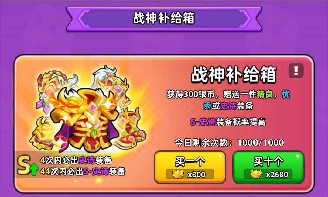 接下来我们来讲s级装备,首先讲战神套。在新手期我们唯一能接触到的s级装备就是战神套。战神套只是一套过渡型的装备,在后期我们可以用它来置换寒冰套和天工套。所以没什么特别可说的。但是注意一点,红色品质的战神目前是没有办法置换的,所以战神套不要升红,这是前期大坑之一。