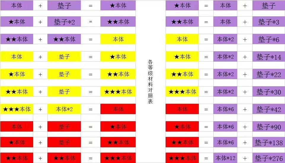 在讲装备之前,我们要先来讲一下装备合成。在紫色之前,装备合成都是三个本体合成的形式,紫色以后就需要垫子了,合成表如下图。另外值得一提的是s类装备最多合成到红色,而ss类装备可以合成到彩金。