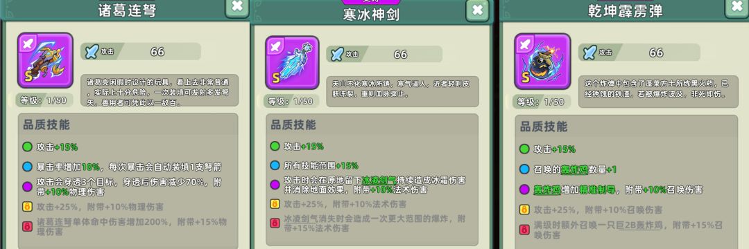 首先介绍s级武器。诸葛连弩是一把足够强劲的纯伤害武器,属于物理流派,数值很高,氪佬平民都爱用,推荐第一把升红的武器。