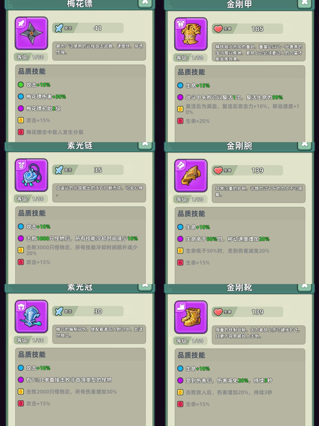 在新手期的过渡,我们弄不到s级装备时,可以用以下装备来代替。梅花标是非常好用的平民神器,即使是大后期用来当副武器也是不错的,所有梅花镖我们都要保留下来不要当垫子。其他所有非s级装备都可以无脑用来当垫子用。