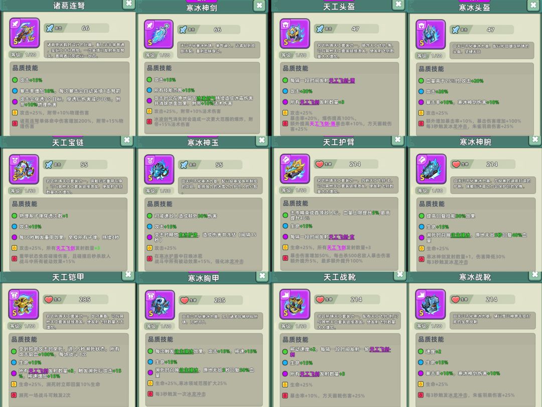 最后介绍的就是套装了,对应物理流派的天工套和法术流派的寒冰套。红色以前天工是要明显优于寒冰的,天工套的天工飞剑紫色就有,而寒冰套的冰龙冲击要红色才会发动。而红色以后两者也都是非常强劲的套装。建议是配合武器和流派进行选择,喜欢散搭的朋友也可以按照大家推荐或者自己喜好来进行搭配,不过后期还是别散搭了,你们看看后期阵法的加成就知道了。